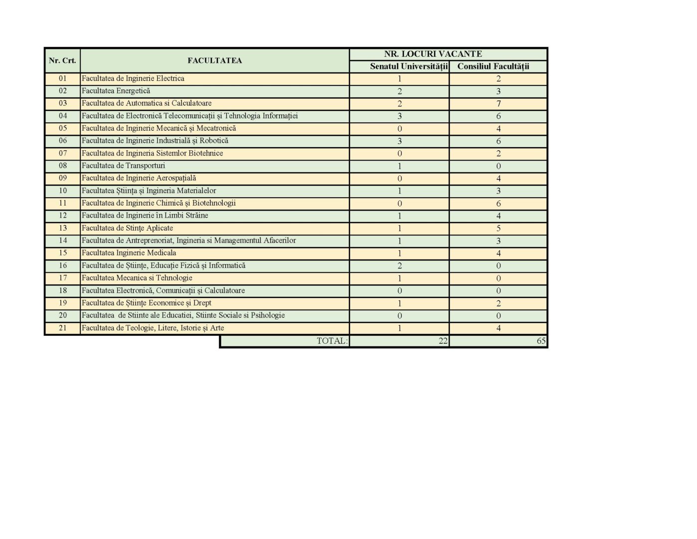 Alegerile pentru reprezentanții studenților pe locurile vacante din Senatul POLITEHNICA București și în Consiliile Facultăților vor avea loc pe data de 23 OCTOMBRIE 2025. Locurile vacante pentru fiecare facultate, atât pentru Centurul Universitar București, cât și pentru Centeuk Universitar Pitești sunt prezentate în tabelul de mai jos: