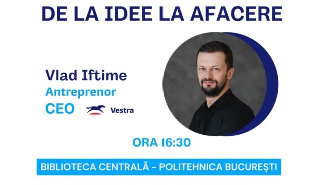 Ai o idee și vrei să o transformi într-un business real?!Te invităm să descoperi cum poți face primii pași în antreprenoriat alături de Vlad Iftime, Antreprenor & CEO Vestra Industry, într-o serie de întâlniri interactive dedicate viitorilor antreprenori!Ce vei învăța: Cum gândește un antreprenor Cum îți identifici oportunitățile Ce tip de antreprenor ești Cum îți dezvolți abilitățile de leadership și