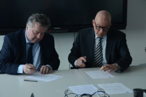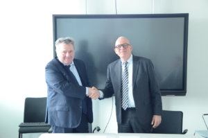 Prof. Tudor Prisecaru (left), President of the Senate of the Politehnica Bucharest, and Prof. Stefan Löhrke (right), Vice President of the RPTU, after signing the Memorandum of Understanding between the two universities.