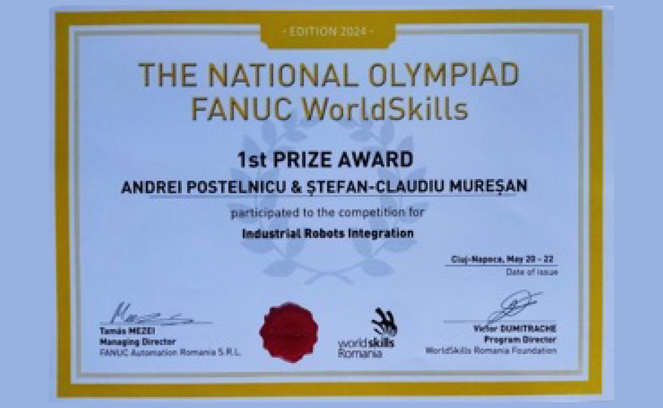 La ediţia anterioară a “Olimpiada de Integrare Roboţi Industriali Fanuc – EuroSkills 2024”, Universitatea Națională de Știință și Tehnologie POLITEHNICA București s-a clasat pe Locul I, obtinând punctajul maxim acordat pentru probele de concurs. Echipa de concurs a Universității Naționale de Știință și Tehnologie POLITEHNICA București a fost formată din Claudiu Muresan (student anul 4 la specializarea Robotică, seful de promoţie 2024) şi Andrei Postelnicu (student anul 1 la specializarea Robotics) din cadrul Facultătii de Inginerie Industrială şi Robotică. Trainingul echipei de concurs a Universității Naționale de Știință și Tehnologie POLITEHNICA București a fost asigurat de către drd. ing. Alexandru Firulescu şi s.l. dr. ing. Bogdan Verdete. Organizarea şi coordonarea activităţii de lansare a competiţiei, pregătire a participanţilor precum şi de selecţie finală a echipei de concurs în faza locală a competiţiei organizată la nivelul Universității Naționale de Știință și Tehnologie POLITEHNICA București au fost coordonate de către prof.dr. ing. Tiberiu Dobrescu directorul Departamentului Roboţi şi Sisteme de Producţie şi prof.dr.ing Adrian Nicolescu.